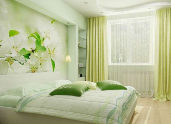 Veggirnir og loftið í svefnherberginu geta einnig verið skreytt með veggfóður í vor og þá munum við á hverjum morgni hlýða með fallegu vorsögu sem mun ákæra þig með gleðilegum skapi og orku fyrir allan daginn. Mynd af blíðu bleikum blómum mun skapa rómantískt skap í svefnherberginu, fylla það með fágun og sátt.